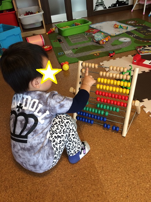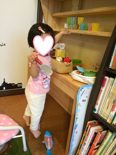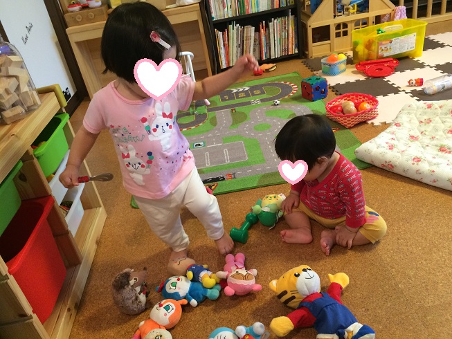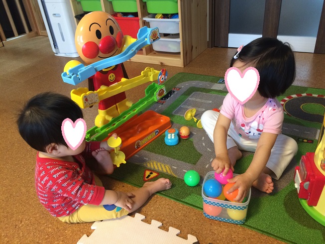 この木のおもちゃを気に入り、遊んでいると娘もやってきたので、