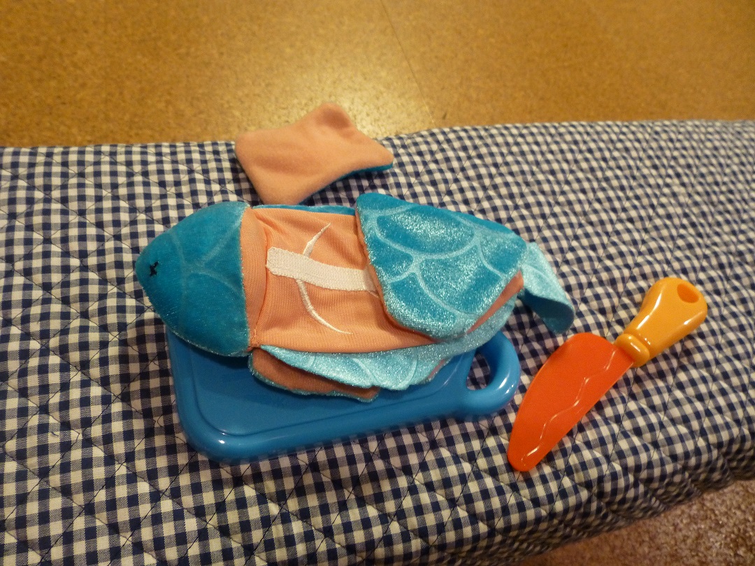 布でできたこんなお魚やお野菜を上手にナイフでサクサクします♪